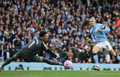 إرلينج هالاند لاعب مانشستر سيتي يسجل في مرمى مانشستر يونايتد خلال مباراة الفريقين يوم الأحد في الدوري الإنجليزي الممتاز لكرة القدم - (Photo by Michael Regan/Getty Images)