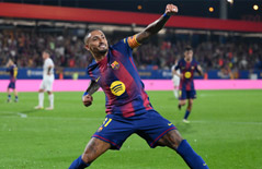 وأضاف "فيرمين لوبيز ليس الوحيد الذي قدم مباراة رائعة، بل الجميع كافحوا واستمتعوا بأداء رائع على أرض الملعب. كان أداء الفريق رائعا في جميع المراكز. النقاط الثلاث مثالية، وبالنسبة لي، من الجيد للغاية الاختيار من هذا العدد الكبير من اللاعبين الرائعين".رافينيا لاعب برشلونة يحتفل بتسجيله الهدف الرابع لفريقه والثاني له في الفوز 6-صفر على بلنسية في مباراتهما بدوري الدرجة الأولى الإسباني لكرة القدم على ملعب يوهان كرويف يوم الأحد - (Photo by David Ramos/Getty Images)